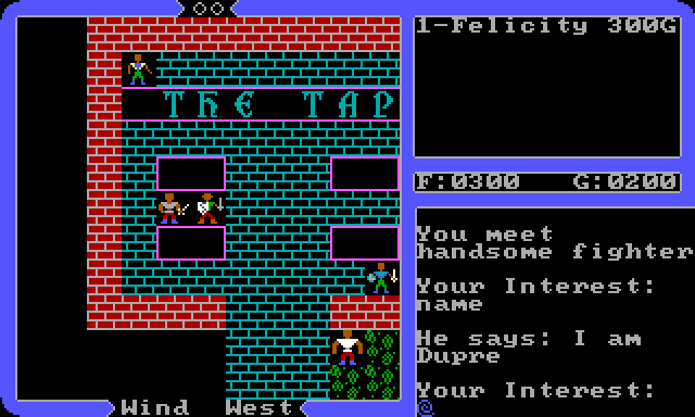 In Ultima III, Dupre could be found in a pub in the town of Britain, telling the Stranger to "Drink up!" - a sentiment very much in tune with his iconic love of alcohol.[6]